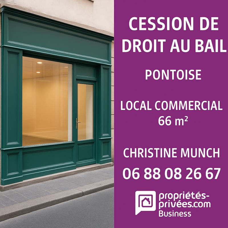 Christine MUNCH vous propose ce local commercial de 66 m², idéalement situé au coeur d'un secteur commerçant particulièrement attractif de Pontoise. Bénéficiant d'un emplacement offrant un flux continu de piétons et d'automobilistes, ainsi que des possibilités de stationnement faciles, ce local constitue une opportunité intéressante pour développer une activité commerciale ou de services dans un environnement vivant et recherché. Doté d'une large devanture, le local offre une excellente visibilité et une luminosité naturelle très appréciable, permettant de recevoir la clientèle dans un cadre agréable. Son bon état général et sa configuration de plain-pied (66 m²) facilitent l'aménagement de nombreuses activités (hors restauration avec extraction). Conditions du bail : Bail commercial 3/6/9 Loyer annuel HT/HC : 14 400 euros (soit 1 200 euros HT/HC par mois) Loyer mensuel TTC : 1 450 euros Dépôt de garantie : 3 mois de loyer Ce local conviendra parfaitement à une enseigne souhaitant s'implanter dans un quartier dynamique et établi, au sein d'un environnement commercial solide et porteur. Prix de cession du droit au bail : 51.000 euros charges vendeur Pour visiter et vous accompagner dans votre projet, contactez Christine MUNCH, au 0688082667 ou, par courriel à c.munch@proprietes-privees.com. Selon l'article L.561.5 du Code Monétaire et Financier, pour l'organisation de la visite, la présentation d'une pièce d'identité vous sera demandée. Cette présente annonce a été rédigée sous la responsabilité éditoriale de Christine MUNCH agissant sous le statut d'agent commercial immatriculé au RSAC PONTOISE 493 698 914 auprès de SAS PROPRIETES PRIVEES, au capital de 44 920 euros, ZAC LE CHÊNE FERRÉ - 44 ALLÉE DES CINQ CONTINENTS 44120 VERTOU; SIRET 487 624 777 00040, RCS Nantes. Carte Professionnelle Transactions sur immeubles et fonds de commerce (T) et Gestion immobilière (G) n°CPI 4401 2016 000 010 388 délivrée par la CCI Nantes - Saint Nazaire. Compte séquestre n°30932508467 BPA SAINT-SEBASTIEN-SUR-LOIRE (44230). Garantie GALIAN-SMABTP - 89 rue de la Boétie, 75008 Paris - n°28137 J pour 2 000 000 euros pour T et 120 000 euros pour G. Assurance responsabilité civile professionnelle par GALIAN-SMABTP n° de police 28137.J Mandat réf : 430703 - Le professionnel garantit et sécurise votre projet immobilier. Christine MUNCH (EI) Agent Commercial - Numéro RSAC : PONTOISE 493 698 914 - . Les informations sur les risques auxquels ce bien est exposé sont disponibles sur le site Géorisques : www. georisques. gouv. fr