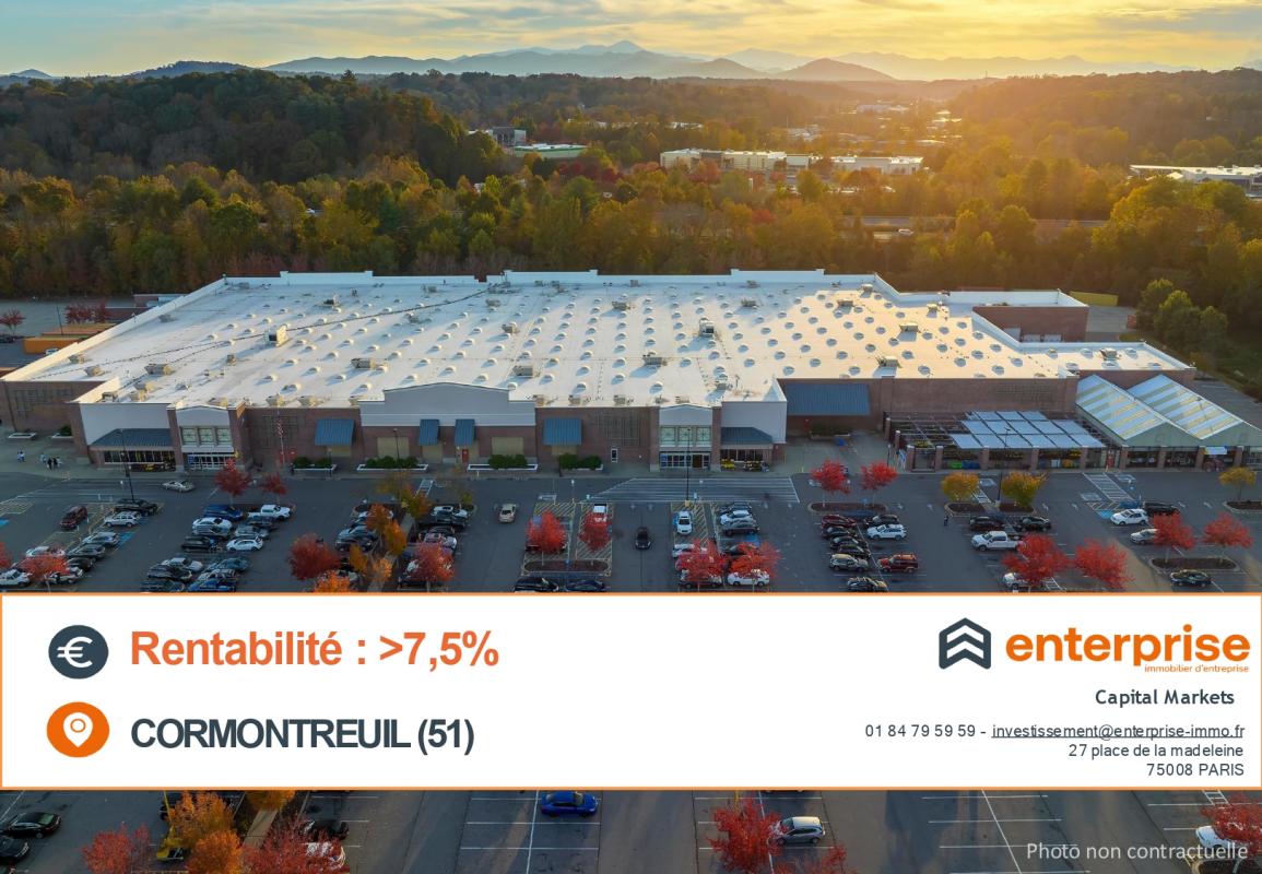Enterprise Immobilier vous présente une très belle opportunité d'investissement patrimoniale : un bâtiment commercial d'environ 1.000 m², situé sur la ville de Cormontreuil, et loué à des enseignes nationales dans le cadre de baux commerciaux classiques. L'emplacement est un emplacement privilégié visible depuis le parking de l'alimentaire et disposant de son flux, cet actif bénéficie d'un emplacement de choix ! Le plus : un très belle emplacement visible et loué à des enseignes nationales notoirement connues Volume d'investissement : 1.100.000 € net vendeur Rentabilité : >7,5 % Honoraires de négociation : à la charge de l'acquéreur #investissement #immobilierdentreprise #murscommerciaux #rentabilité #realestate #opportunité #enterpriseimmobilier Prestations : Bon état