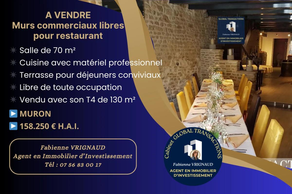 Murs commerciaux libres d'un ancien restaurant au cœur de MURON (17430). Idéal pour un couple souhaitant s'installer et démarrer son activité sans attendre, cet ancien restaurant offre un cadre chaleureux et authentique, avec de beaux volumes et un vrai potentiel de développement. Un intérieur plein de charme avec sa salle de 70 m² avec pierres apparentes et cheminée, parfaite pour créer une ambiance conviviale. Une cuisine professionnelle équipée, prête à fonctionner. Un espace extérieur avec terrasse, idéal pour les déjeuners ensoleillés, repas de groupe... Un vrai atout : un appartement T4 inclus ! Le bien est vendu avec un appartement T4 situé à l'étage, permettant d'habiter sur place. Un avantage rare pour concilier vie personnelle et projet professionnel. Un emplacement stratégique : MURON, offre un cadre de vie paisible tout en restant proche des grands axes et bassins d'activité : - 10 km de Surgères - 16 km de Rochefort - 30 km de Saint-Jean-d'Angély - 45 km de La Rochelle Les informations sur les risques auxquels ce bien est exposé sont disponibles sur le site Géorisques : georisques. gouv. fr. Prix du bien : 158.250 € HAI. Prix du bien hors honoraires : 150.000 €. Honoraires : 8.5250 € TTC. Honoraires à la charge de : Acquéreur. -*-